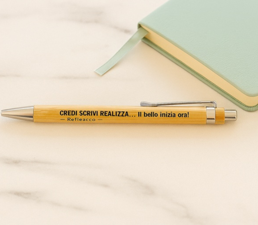 Sul corpo in bambù è incisa la frase “Credi, Scrivi, Realizza… Il bello inizia ora!”, un messaggio che invita a credere nei propri sogni e a trasformarli in realtà. Ogni parola diventa così un piccolo passo verso la realizzazione personale.