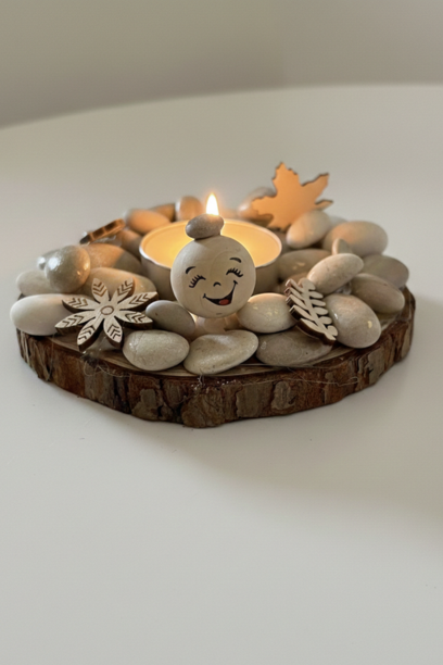 Realizzato interamente a mano, il portacandela poggia su una solida base di legno naturale che conserva intatta la bellezza della sua corteccia originale. Al centro, una corona di pietre di fiume levigate avvolge il punto luce, creando un contrasto materico tra la forza della terra e la delicatezza della fiamma. Il protagonista indiscusso è il piccolo custode in legno: un volto sorridente dipinto a mano che trasforma l’oggetto in un potente simbolo motivazionale, invitandoti a ritrovare la serenità quotidiana attraverso la semplicità.