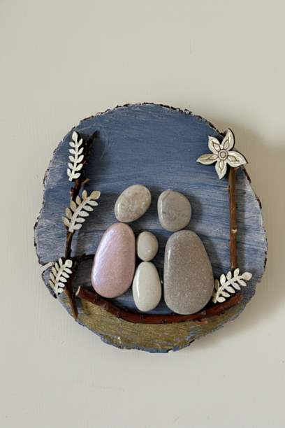L’opera gioca su contrasti materici affascinanti: la rugosità del legno grezzo accoglie la liscezza dei sassi, mentre piccoli rami e fiori intagliati incorniciano la scena come un nido protettivo. Lo sfondo, dalle tonalità profonde e sfumate, trasforma il supporto in un piccolo orizzonte domestico, rendendo ogni pezzo un’opera unica di design ecosostenibile.